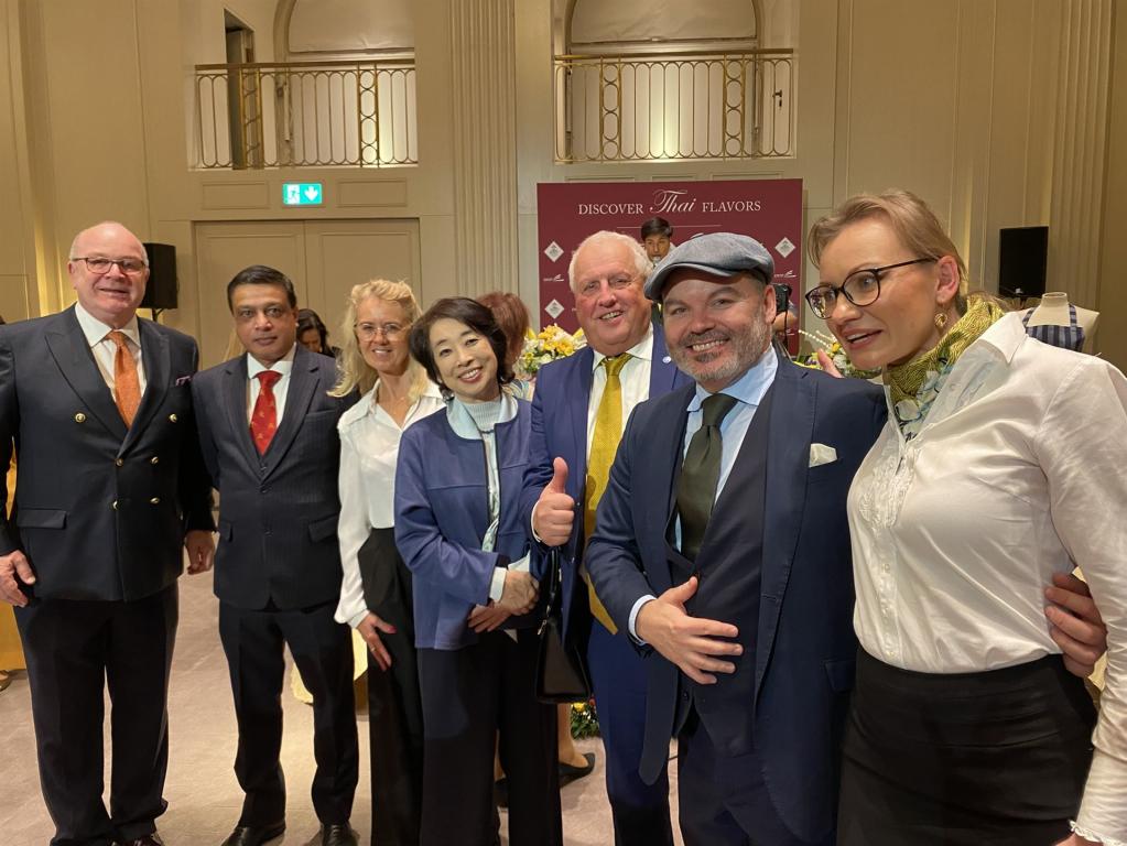 BotschafterinMitsuko Shina im Kreise netter Kontakte auf dem Empfang der Botschaft Thailands zum Nationalfeiertag im Hotel Adlon u.a. mit Bianca Erben (Contargo AG), Indiens Verteidigungsattache Sanjay (Ruder-Union Arkona Berlin), Gustavo Gardini Deutsche Bahn Global Network & Ehefrau Eva sowie Director General & Honorary Trade Advisor of Thailand in Germany