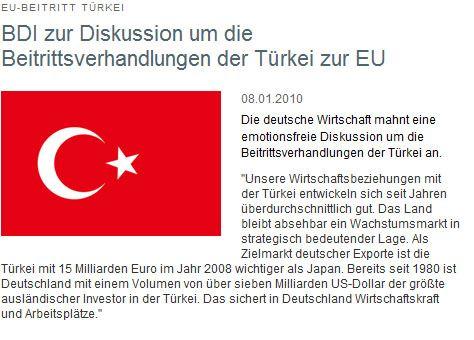 Ohne die Türkei sei Europa "nicht stärker, sondern schwächer, nicht mehr, sondern weniger sicher, nicht reicher, sondern ärmer", sagte Cameron. Ihn mache "wütend", wie eine EU-Mitgliedschaft der Türkei seit Beginn der Beitrittsverhandlungen 2005 blockiert werde. Unter Verweis auf die türkischen Leistungen als Nato-Partnerin und Verbündete in Afghanistan sagte er, es sei schlicht "Unrecht" zu sagen, die Türkei "darf das Lager bewachen, aber nicht im Zelt sitzen". Aus: Der Tagesspiegel vom 27.7.2010 "Cameron wird Deutschland Doppelmoral vor"