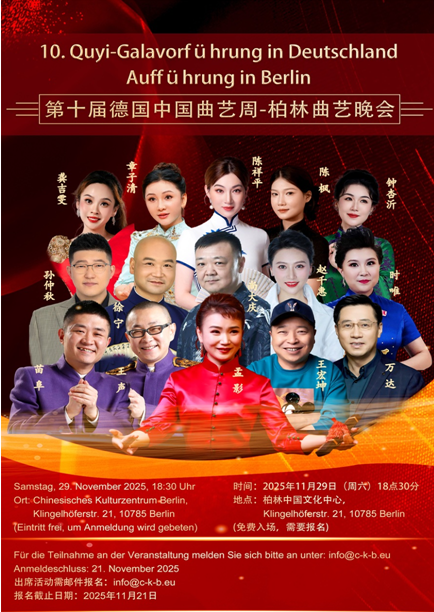 Zeit: Samstag, 29. November 2025, 18:30 Uhr, (Einlass und Registrierung ab 18:00 Uhr), Ort: Chinesisches Kulturzentrum Berlin, Klingelhöferstr. 21, 10785 Berlin, Sprache: Chinesisch, Anmeldung erforderlich bis zum 21. November per E-Mail an: info@c-k-b.eu, Eine Bestätigungsmail ist erforderlich.